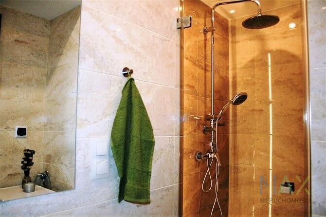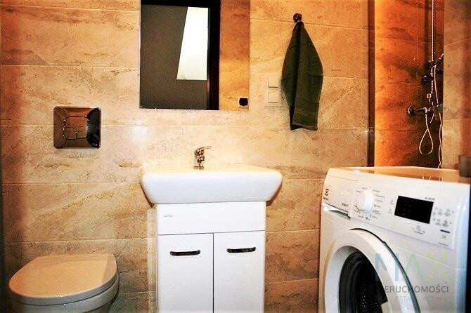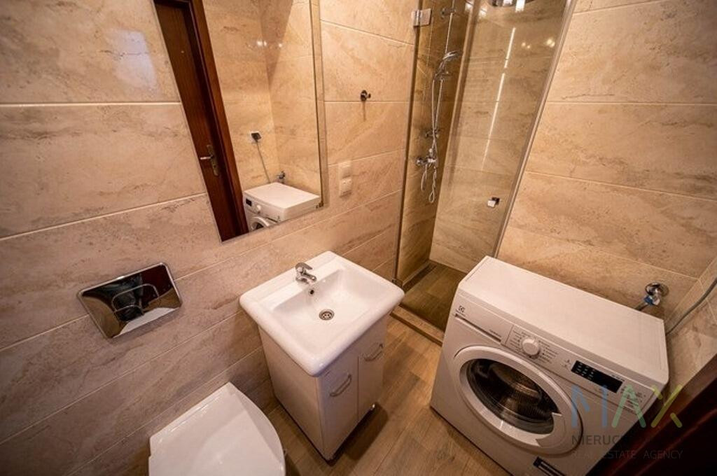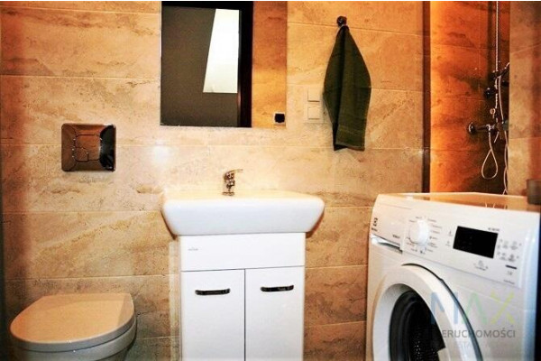 W pokoju dwuosobowa, rozkładana kanapa, pojemna szafa, stół z krzesłami i półki na książki. W aneksie kuchennym piekarnik, płyta ceramiczna, okap, lodówka, szafki stojące i wiszące. Łazienka we flizach z prysznicem, toaletą, umywalką z lustrem i pralką.