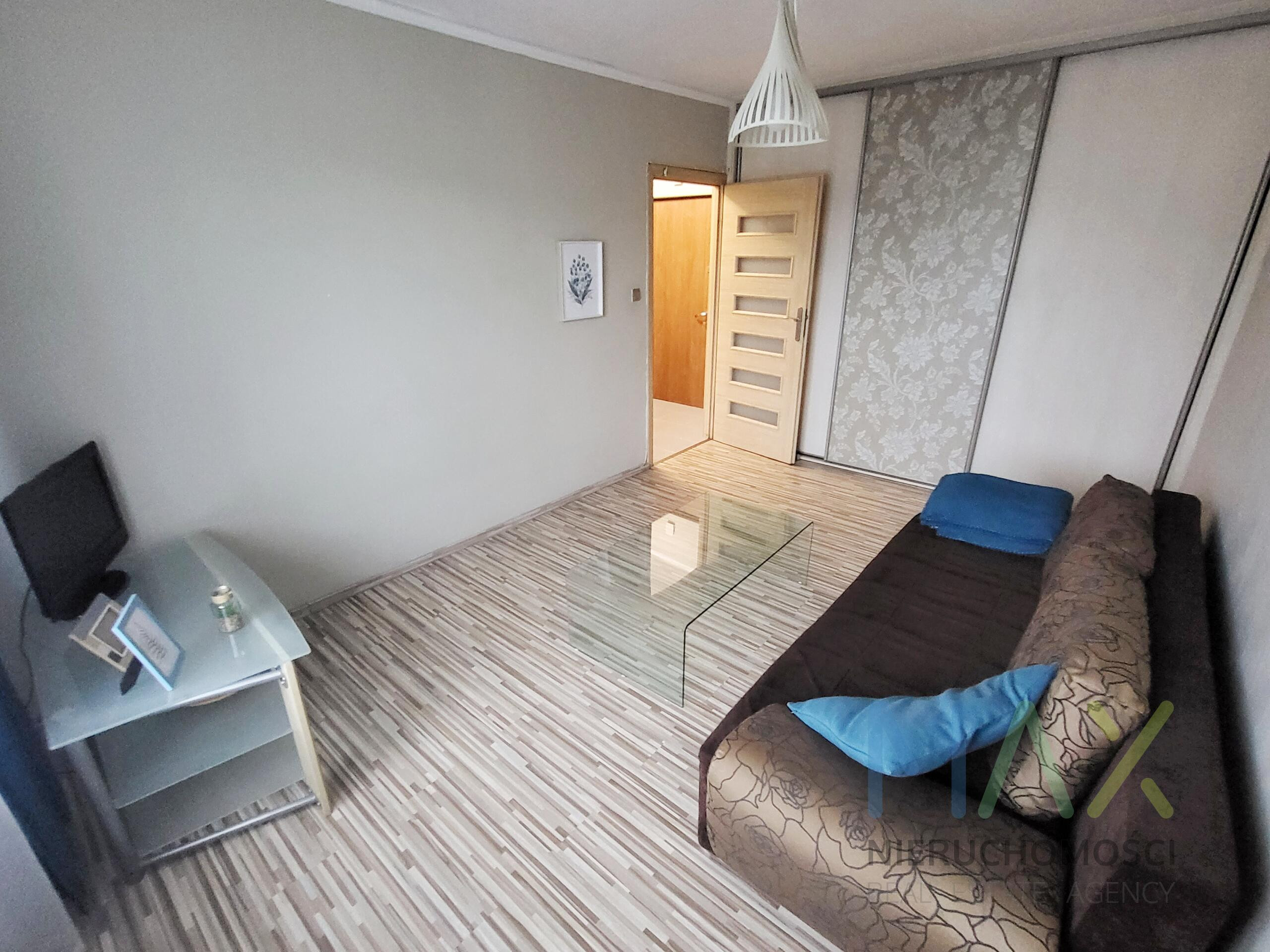 Mieszkanie jest rozkładowe - składa się z 2 niezależnych pokoi, osobnej, widnej kuchni, łazienki z wanną i przedpokoju. Antywłamaniowe drzwi wejściowe. Duży pokój - ogromna , szafa zabudowana na wymiar typu "Komandor", sofa, stolik kawowy, 2 foteliki, regał pod TV. Mały pokój - stolik kawowy, rozkładany fotel.. Kuchnia w pełni umeblowana i wyposażona (lodówko-zamrażarka, kuchenka, gazowa z piekarnikiem elektrycznym, czajnik bezprzewodowy. Łazienka - wanna, umywalka, wc Geberit, pralka. Przedpokój - szafa narożna, szafki na obuwie.