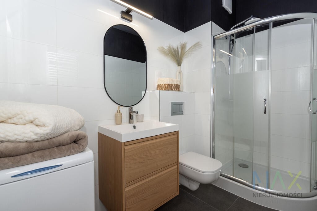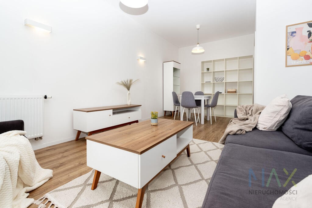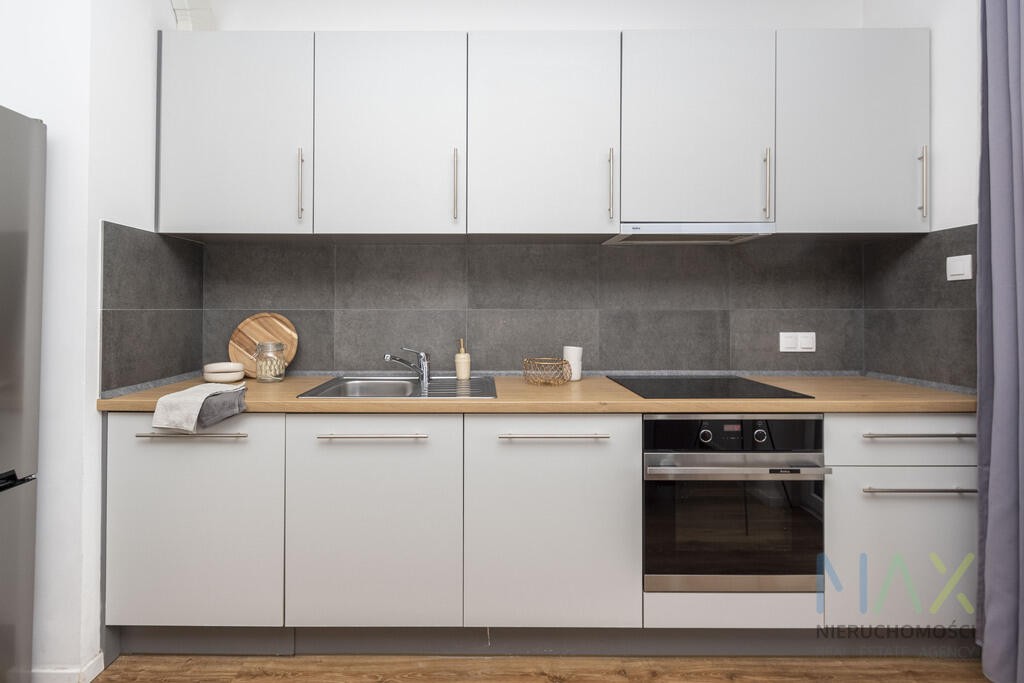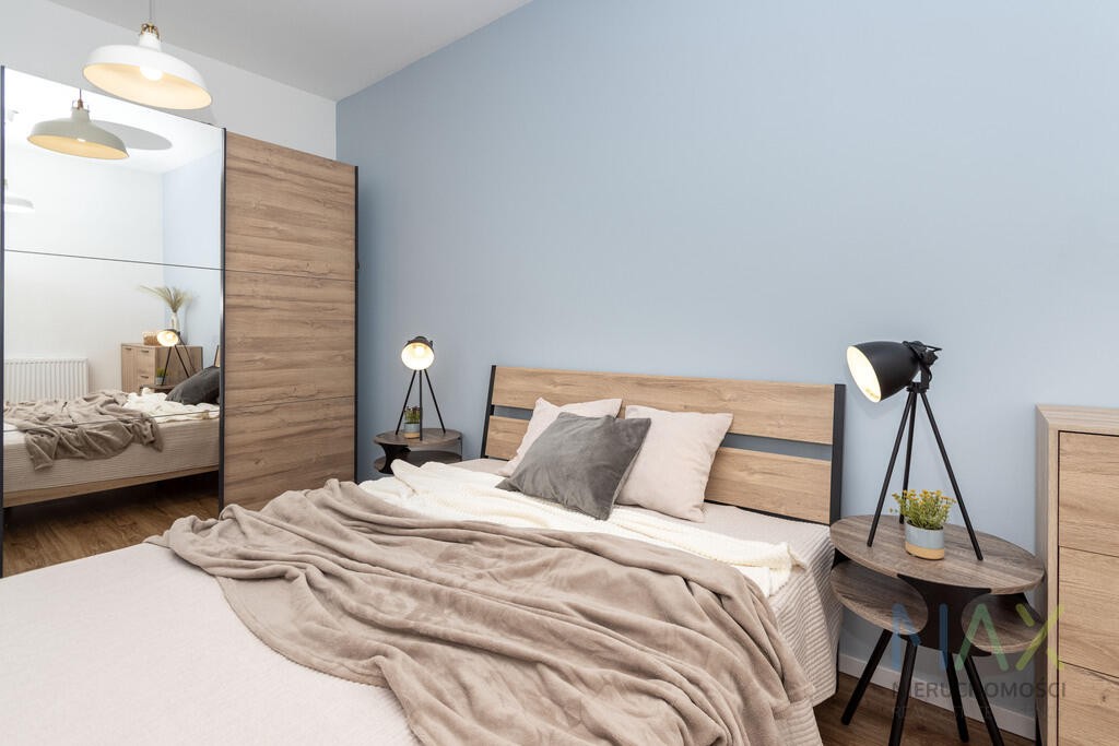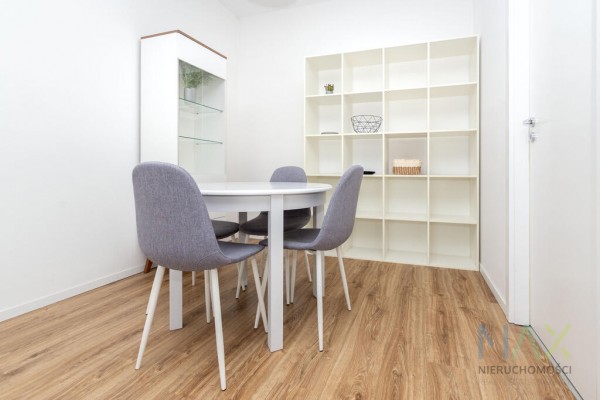 Mieszkanie posiada w pełni umeblowany i wyposażony aneks kuchenny (płyta grzewcza, piekarnik, zmywarka, lodówka) oraz umeblowany pokój. W łazience znajduje się prysznic oraz pralka. W przedpokoju szafa.