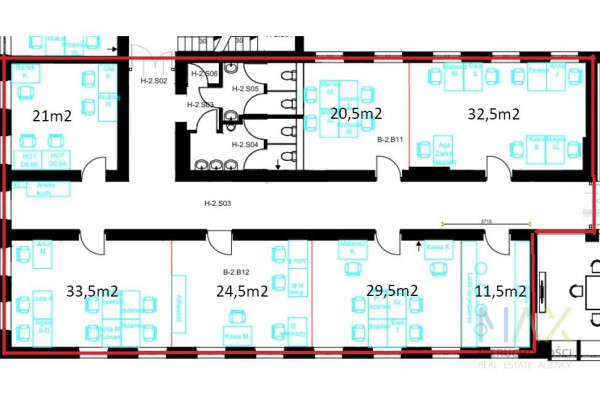 Na lokal skład sie 7 pomieszczeń biurowych, ankes sanitarny oraz kuchenny oraz 4 punkty z możliwościa zaaranżowana aneksu socjalnego.