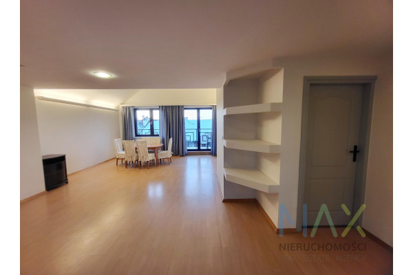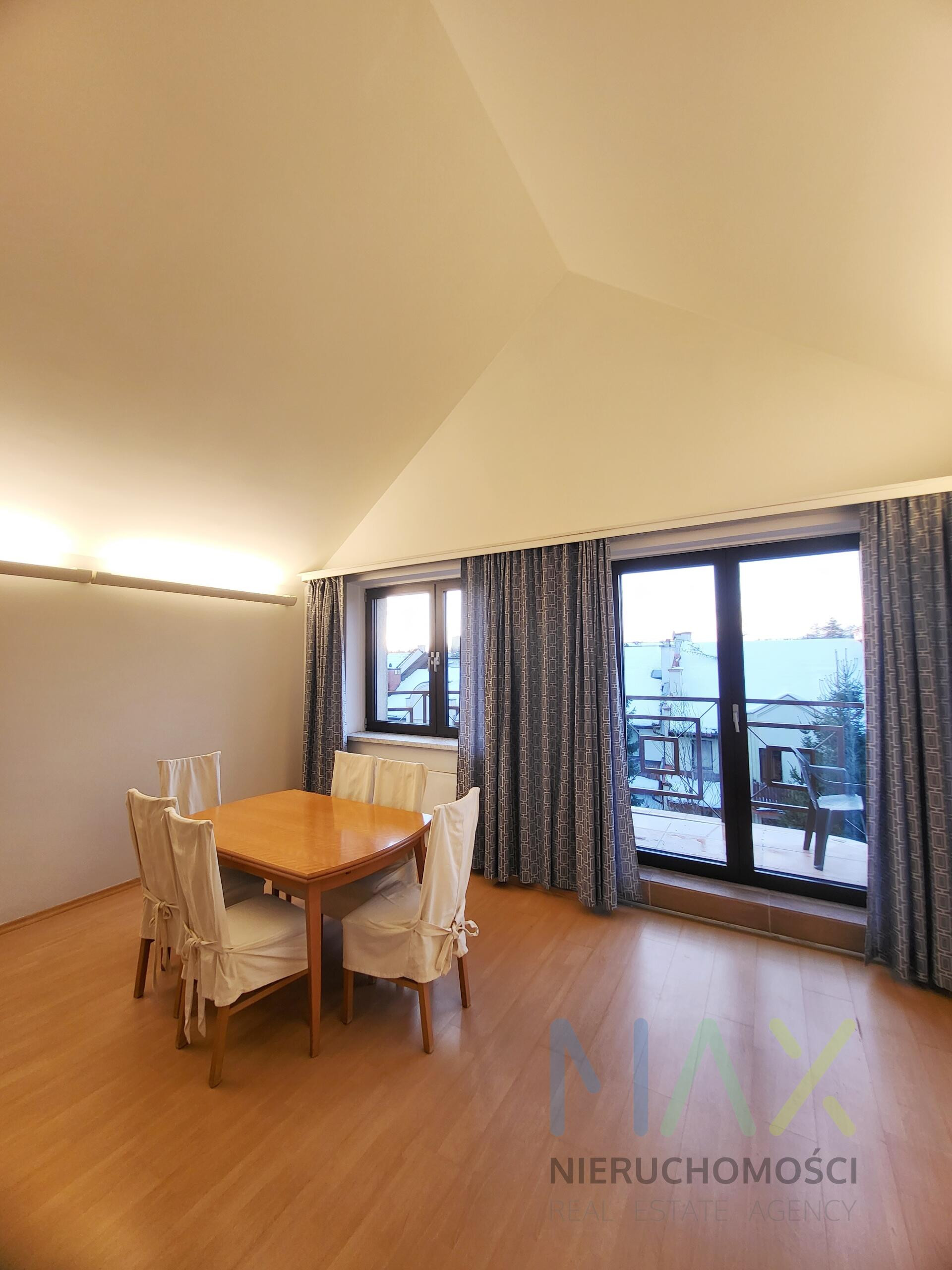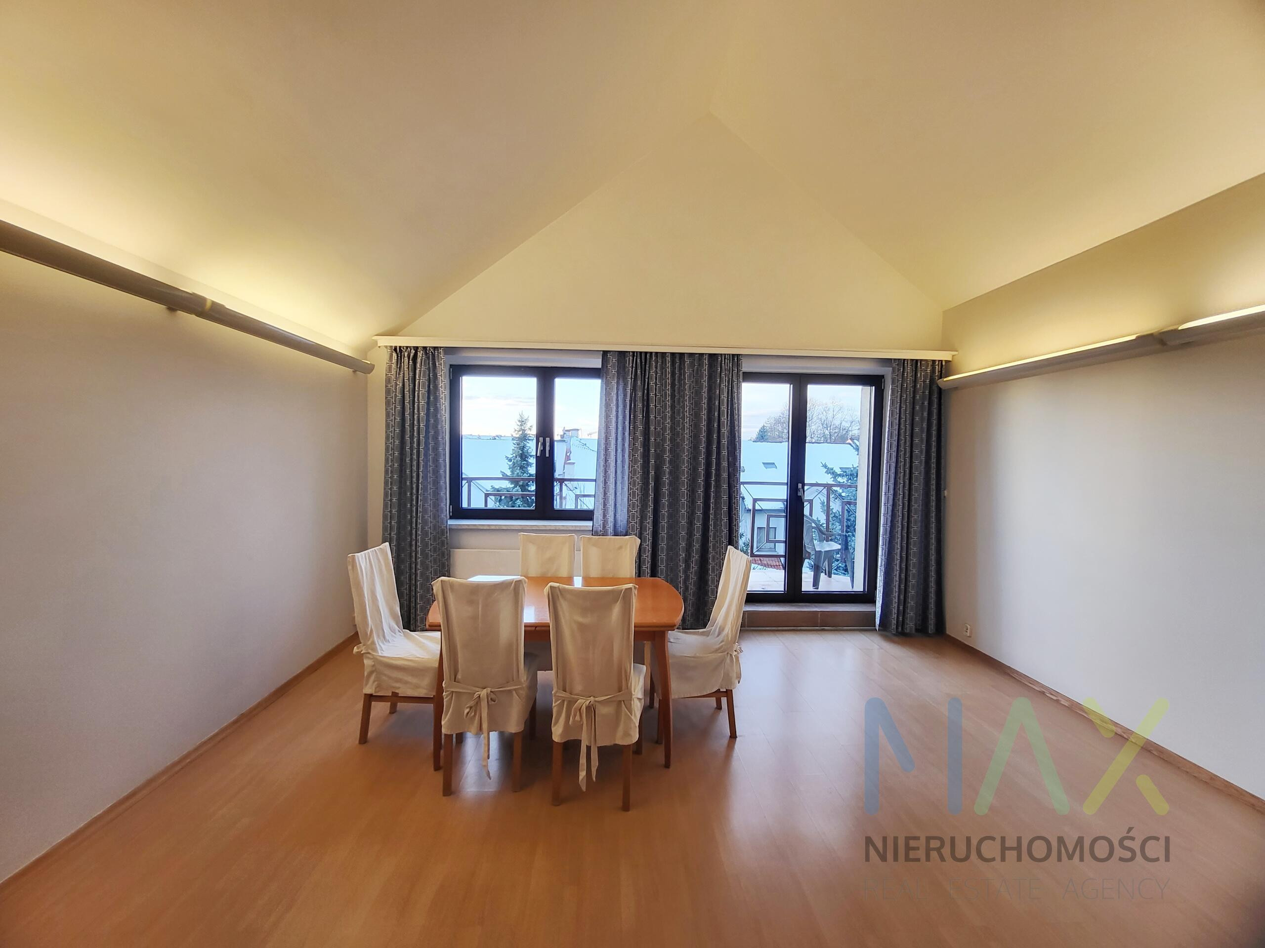 W salonie jest spory stół z 6 krzesłami oraz zbudowana na wymiar szafa w sypialni.