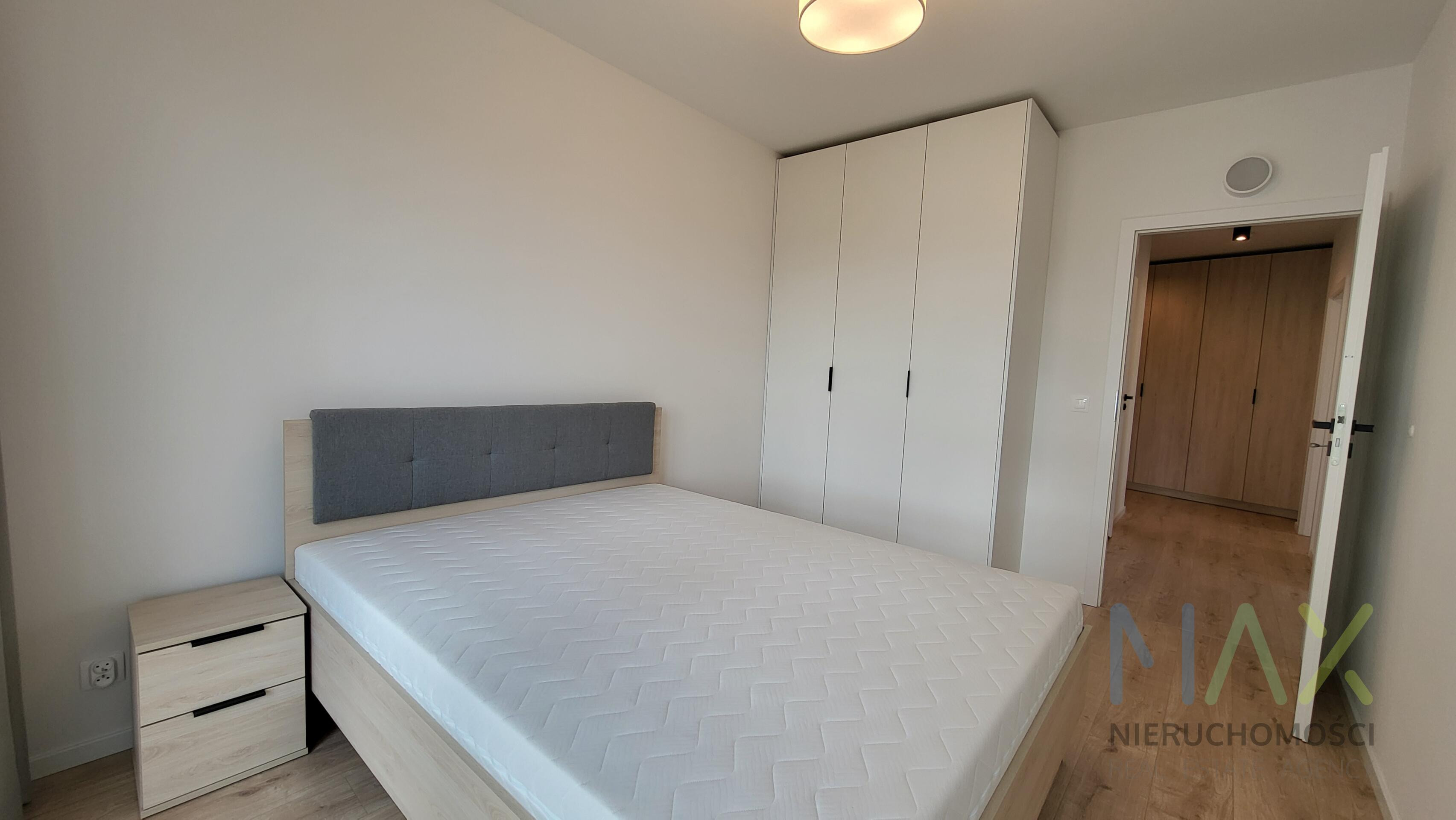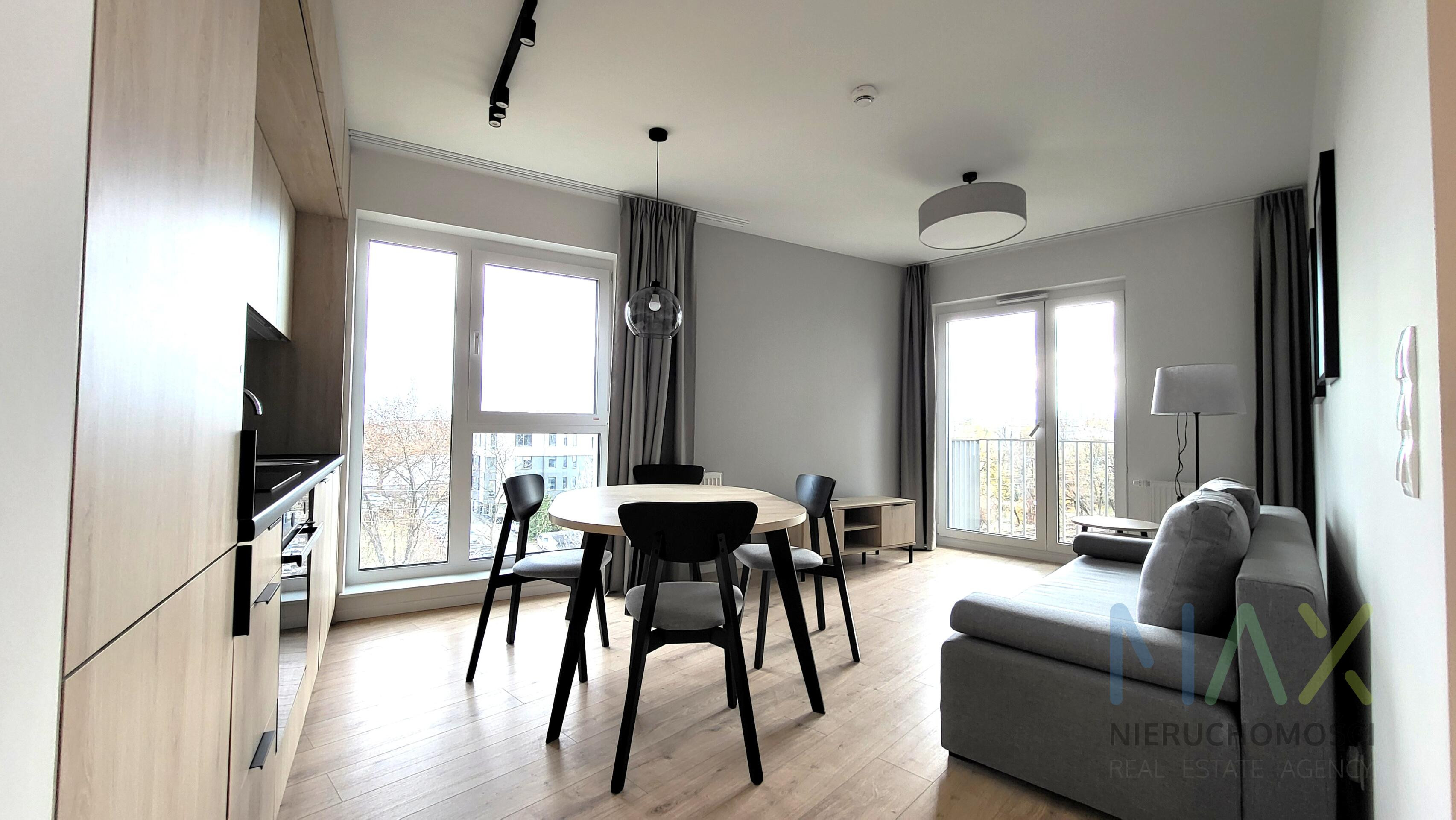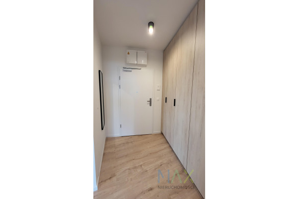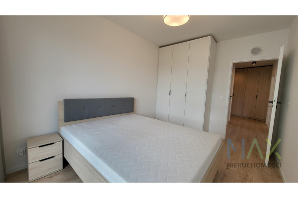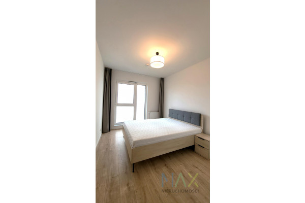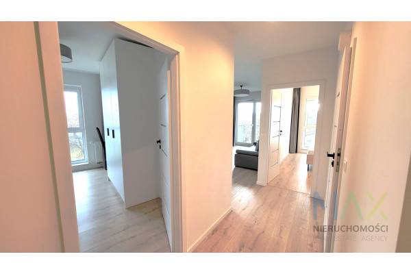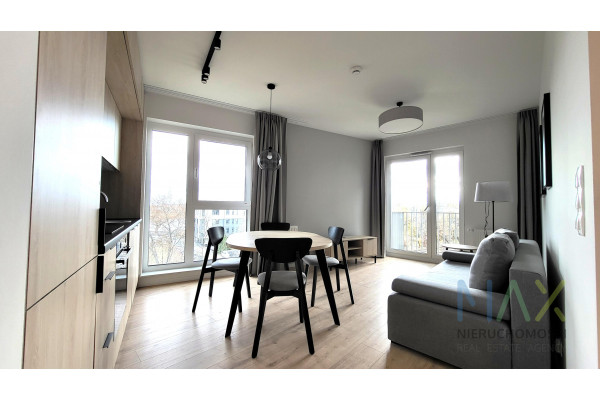 Sypialnia, pokój, salon z aneksem kuchennym (płyta grzewcza, piekarnik, zmywarka, lodówko-zamrażarka), garderoba, łazienka, przedpokój, balkon.