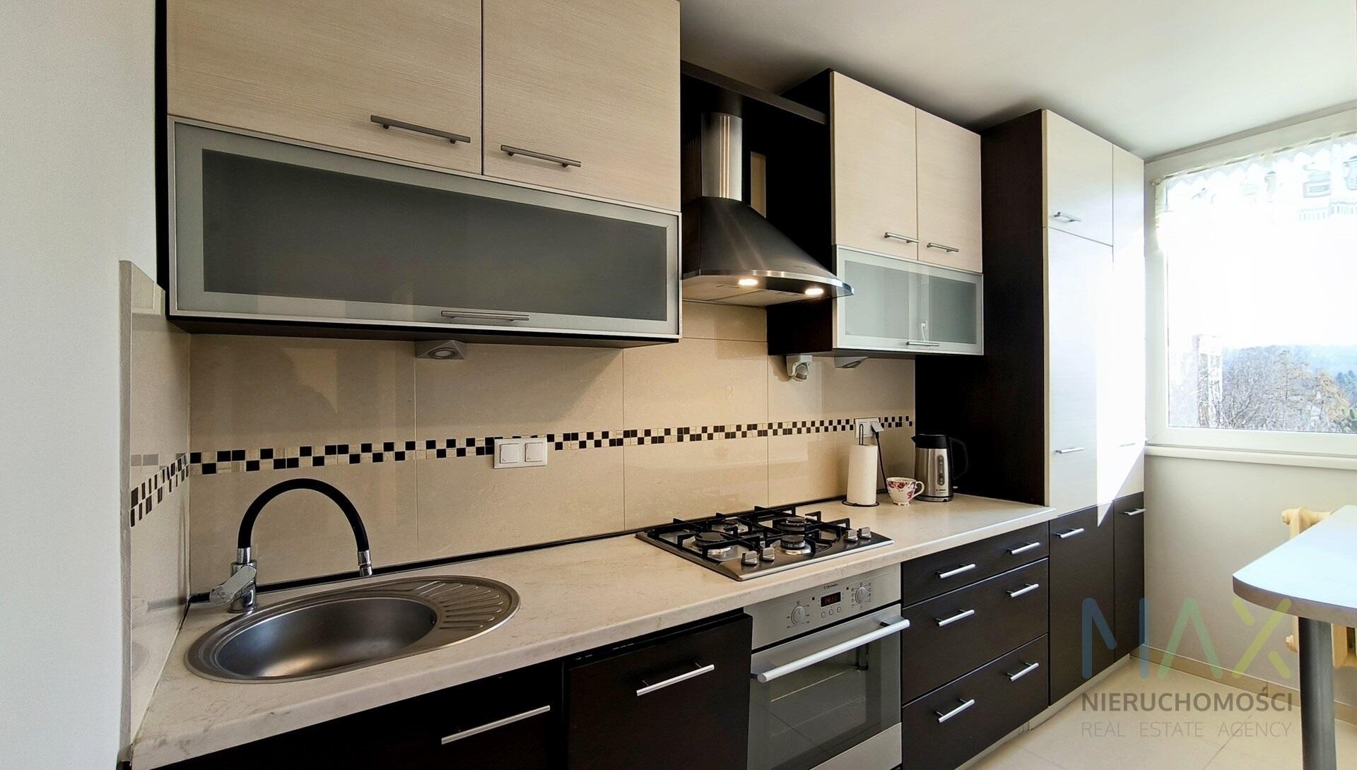 Kuchnia: szafki stojące i wiszące w zabudowie, lodówko-zamrażarka, okap, 4-palnikowa płyta gazowa, zmywarka, piekarnik, zlewozmywak, czajnik.