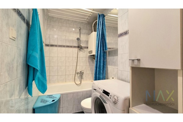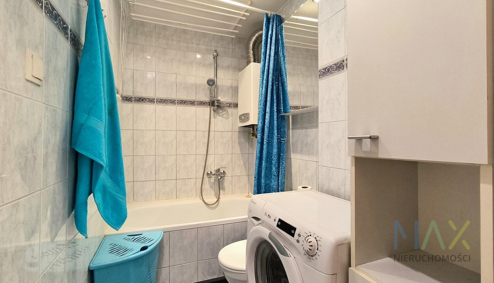 Łazienka: pralka, wanna, WC, szafka.