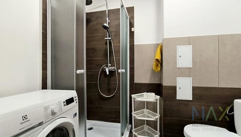 Łazienka: kabina prysznicowa, umywalka, szafki, WC, pralka.