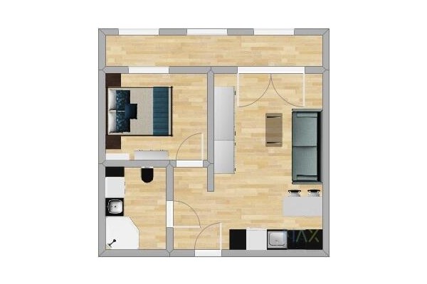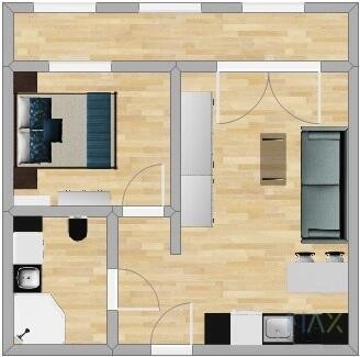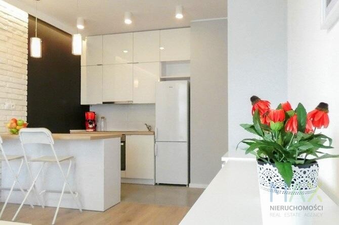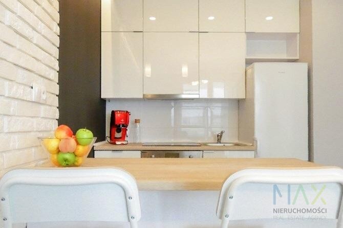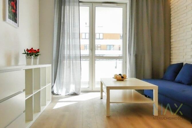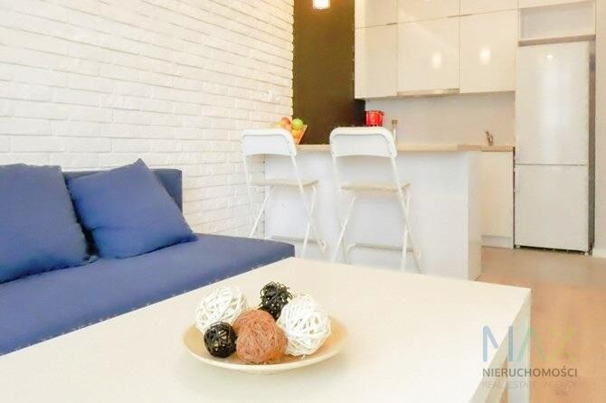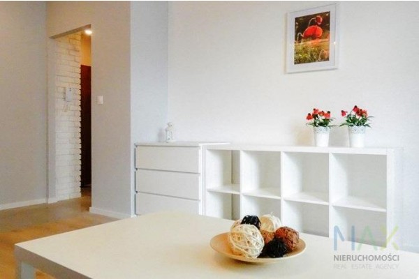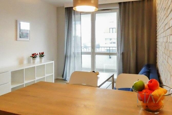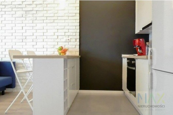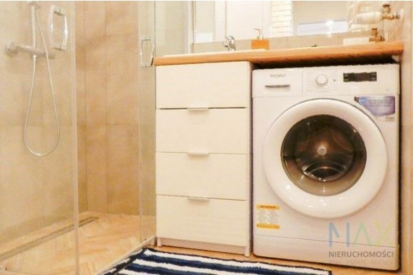 W salonie podwójne okno balkonowe, podwójna, rozkładana kanapa, stolik kawowy, półka na książki i komoda. W aneksie kuchennym szafki wiszące i stojące, wyspa z krzesłami barowymi, zmywarka, piekarnik, lodówka, okap i zlew. W sypialni podwójne, wygodne łóżko, półki przy łóżku oraz szafa na ubrania. W łazience kabina prysznicowa, toaleta, umywalka, pralka. W przedpokoju wieszak na ubrania i lustro.